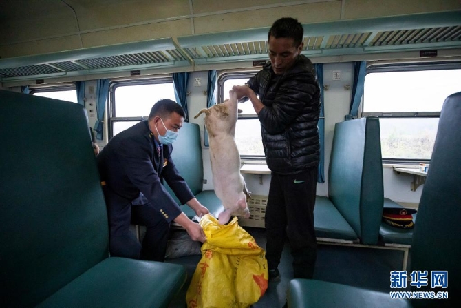来自越西县苏姑乡的彝族乘客吉木木加(右)带上火车的小猪从袋子里爬了出来,中国铁路成都局集团公司成都客运段5633次彝族列车员俄木日古帮他把小猪重新装好(4月11日摄)。5633/5634次列车特别配备了6名彝族列车员,以更好地为当地彝族百姓服务。新华社记者 沈伯韩 摄
