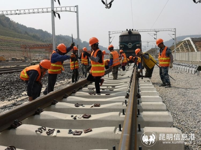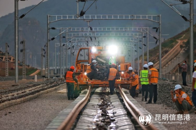 采用两台铺轨机上下行线路同时铺轨,2月中旬开始增加磨憨至玉溪方向反向人工铺轨作业,昼夜施工,铺轨抵达普洱,实现铺轨过半目标。