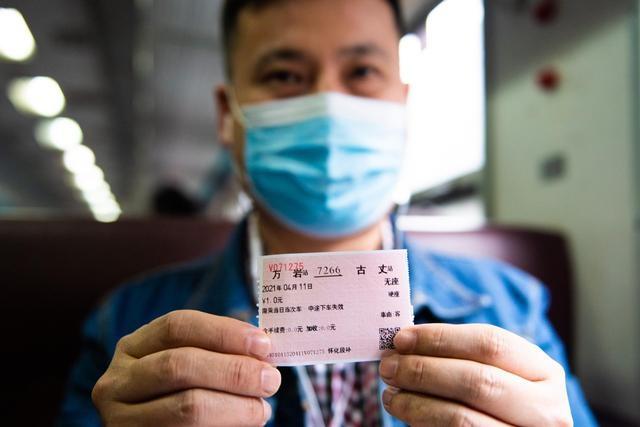 ↑4月11日,乘坐7266次列车的乘客展示“万岩站-古丈站”的一元火车票。