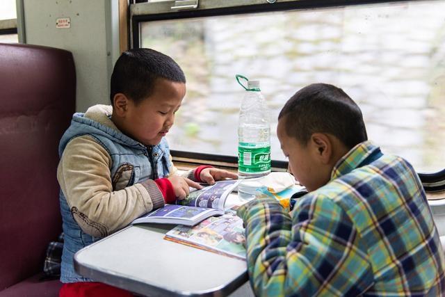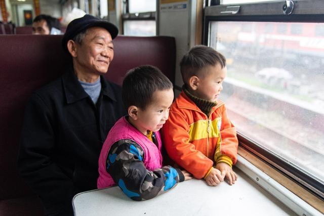 ↑4月11日,在7266次列车上,爷爷带着两个孙子望向窗外。
