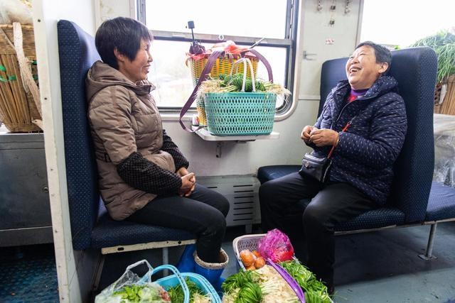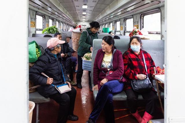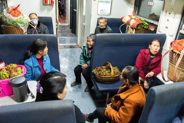 ↑4月11日,已将蔬菜全部售出的乘客在7265次列车上围着空背篓聊天。