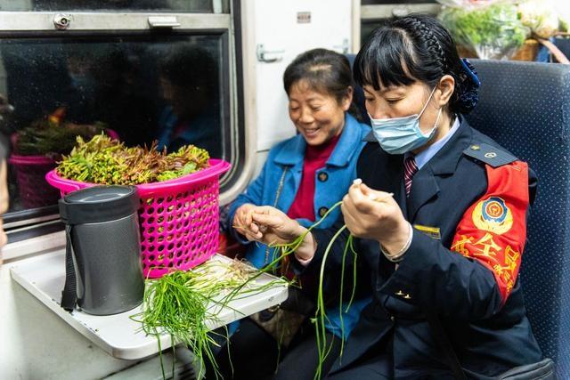 ↑4月11日,乘务员在7266次列车上帮助乘客处理刚采摘的香葱。