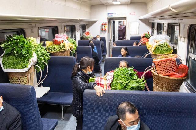 ↑4月11日,在7266次列车上,一名乘客扶着蔬菜背篓。