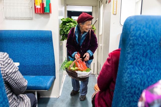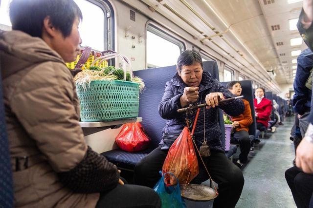 ↑4月11日,一名乘客在7266次列车上出售蔬菜。