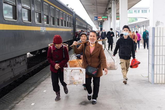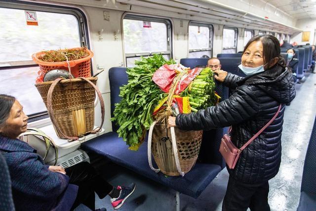 ↑4月11日,乘坐7265次列车的乘客背着售空的蔬菜筐在吉首站上车回家。
