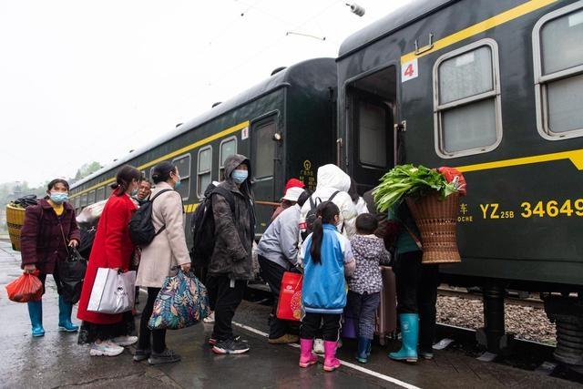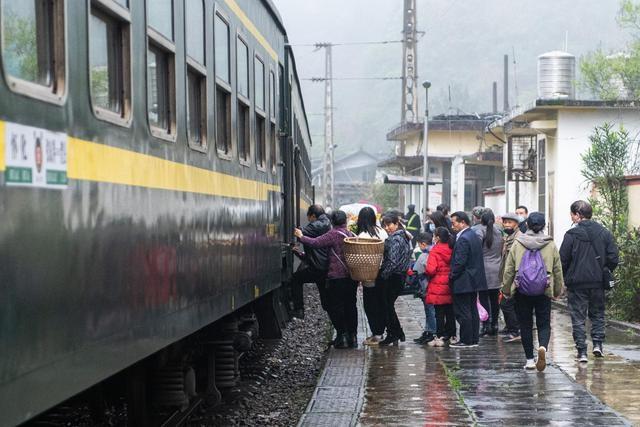 ↑4月11日,乘坐7266次列车的乘客在大龙村站上车。