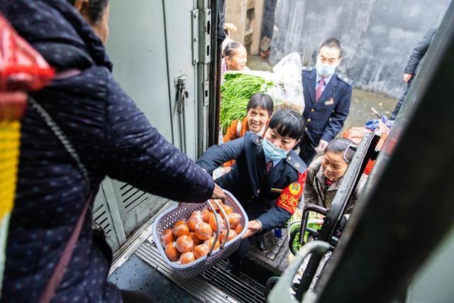 ↑4月11日,乘务员在谷达坡站传递蔬菜,协助乘坐7266次列车的乘客上车。