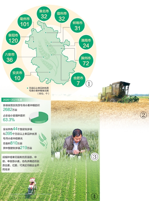 现在,安徽正抓紧探索小麦“单种、单收、单储和专用”的产销加一体化模式,立足品种特点和气候土壤条件,因地制宜发展专用小麦品种。2020年秋种,全省建成优质专用小麦整建制乡镇44个,种植面积达219万亩。