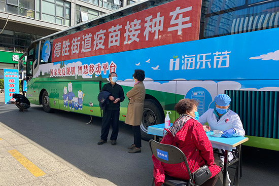 4月1日,德胜街道成立移动接种专班。两辆接种车“分兵”两路,分别覆盖老年人居多的社区和辖区内商务楼宇。“以接种车为中心,等候、登记、接种、留观分区进行。每天每辆车储备疫苗600剂左右,采取集中安排、散发预约的灵活方式,快速高效。”刘宏宇说。