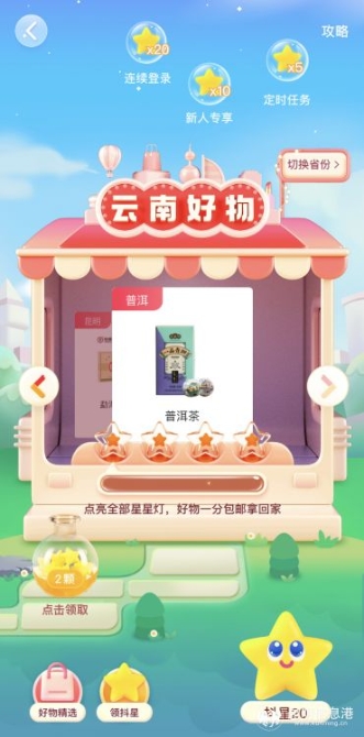 用户打开抖音,进入“我-我的订单”页面,点击右侧顶部“抖星换好物”标识,即可参加该活动。活动中,用户可以浏览并选定自己想要兑换的区域好物,通过收集产品内的漂浮抖星、抖星瓶、每日任务等方式获得一定数量的抖星,获取的抖星可以点亮商品对应的星星灯。当所选商品对应的4颗星星灯被全部点亮后,用户就可只花一分钱,享受所选商品包邮到家的服务。