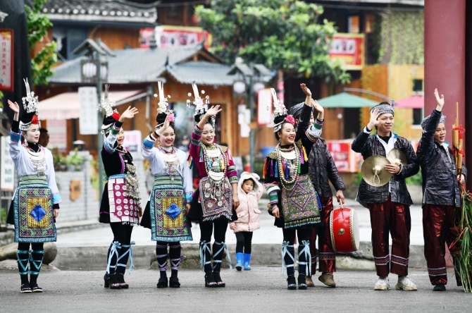4月10日,在贵州省江口县寨沙侗寨,演员和村民送别游客。新华社记者 杨文斌 摄