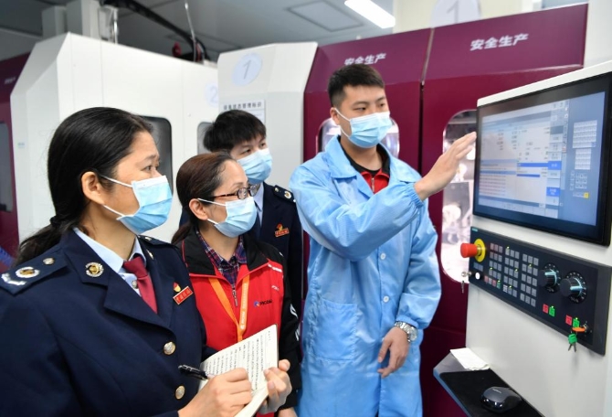 4月14日,在福建福光股份有限公司生产车间,福州经济技术开发区税务局的税收专家团队将企业的基本情况、享受税收优惠情况等登记造册。新华社记者 魏培全 摄