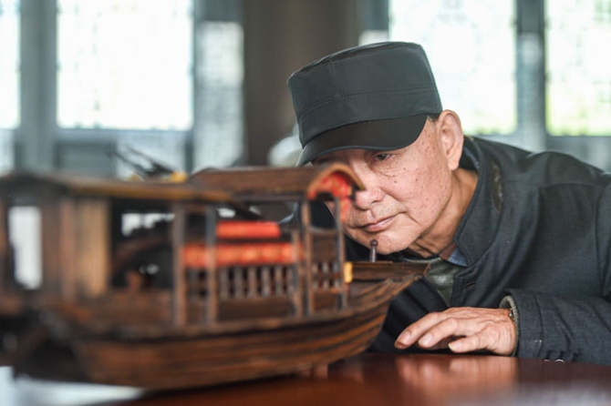 4月13日,韩鸣华在仔细端详一艘制作完成的红船模型。新华社记者江汉摄