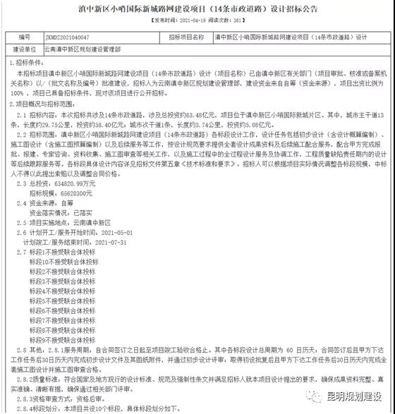 4月19日,云南滇中新区规划建设管理部发布《滇中新区小哨国际新城路网建设项目(14条市政道路)设计招标公告》,计划投资约63.48亿元建设14条市政道路。