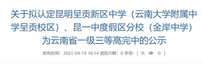 昆明信息港讯 记者上官艳君 4月19日,记者从昆明市教育体育局官网获悉,在学校自评、区教育体育局初评和市级专家初勘基础上,市政府教育督导委员会办公室组织专家进行了复评,经昆明市教育体育局局务会审议通过,拟认定昆明呈贡新区中学(云南大学附属中学呈贡校区)、昆一中度假区分校(金岸中学)为云南省一级三等高完中。