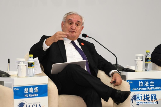 法国前总理拉法兰在博鳌亚洲论坛2018年年会“改革开放40年:中国与世界”电视辩论上发言(2018年4月10日摄)。新华社记者 杨冠宇 摄