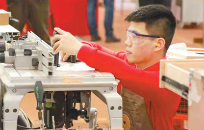 图为江西环境工程职业学院学生彭洪君参加职业技能大赛家具制作项目。熊杰 摄(人民视觉)