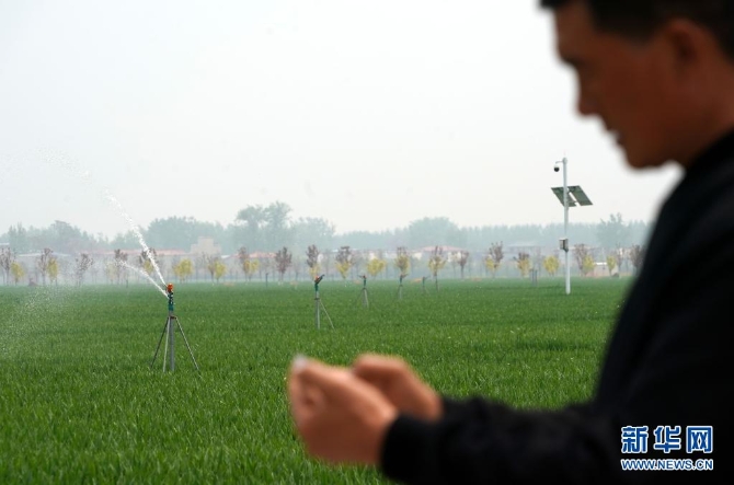 在河南省商水县南陵村一处高标准农田里,种粮大户邱守先使用手机操控设备对小麦田进行喷灌(4月14日摄)。 新华社记者 李安 摄