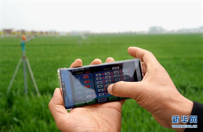 邱守先在商水县高标准农田示范区的张庄镇南陵村流转了2100亩土地,整个春管都几乎只靠他一人和一部手机。“现在都智能化了,只要有手机,我一个人管2000多亩地也不费劲。”说话工夫,邱守先在手机上一通操作,10秒钟后,一排排矗立在麦田之中的喷灌设备又开始缓缓运作。