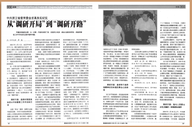 浙江省委还制定了《关于调查研究工作规范化制度化的意见》,明确将调查研究作为县以上党委和政府重大决策的前置程序。由此,习近平的“调研开局”促成了整个领导班子的“调研开路”。