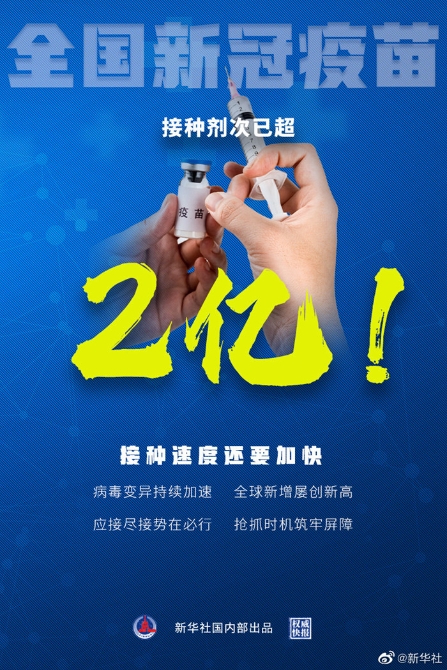 21日国务院联防联控机制新闻发布会上,国家卫健委新闻发言人米锋介绍,截至目前,我国新冠疫苗接种超2亿剂次。全球疫情仍处于高水平流行期,全球新增确诊病例数已连续8周上升,其中上周新增526万例,为疫情发生以来单周最高,病毒继续出现新的变种,外防输入、内防反弹任务艰巨,务必加快推进新冠疫苗接种,应接尽接。