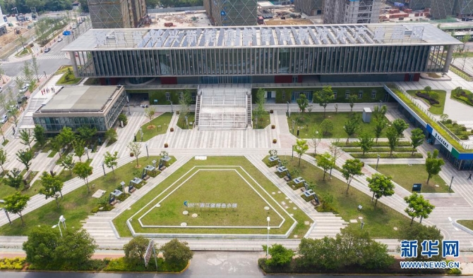 空中俯瞰浙江省长兴县画溪街道新能源小镇“城市客厅”(2020年5月21日摄,无人机照片)。新能源小镇“城市客厅”采用分布式光伏建筑一体化发电系统,年发电量达28万千瓦时,在满足建筑主体自用的前提下,多余电量还可并入电网,产生“绿色收益”。新华社记者徐昱/摄
