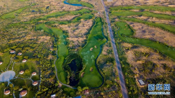 这是位于库布其沙漠中的七星湖景区(2018年7月11日摄,无人机照片)。新华社记者彭源/摄