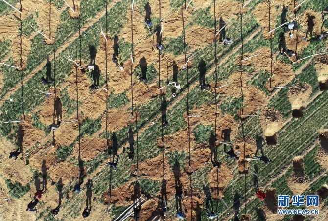 志愿者在河北省武安市伯延镇伯延村植树(2019年3月12日摄,无人机照片)。新华社记者 王晓/摄