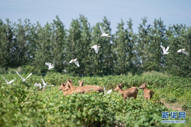 这是在湖南岳阳东洞庭湖麋鹿和鸟类救治避难中心拍摄的麋鹿和飞鸟(2020年8月7日摄)。新华社记者陈思汗/摄