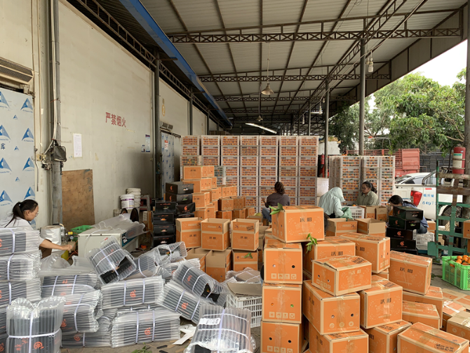 在水果分拣、包装车间里,工人们正在给分了等级的沃柑装箱