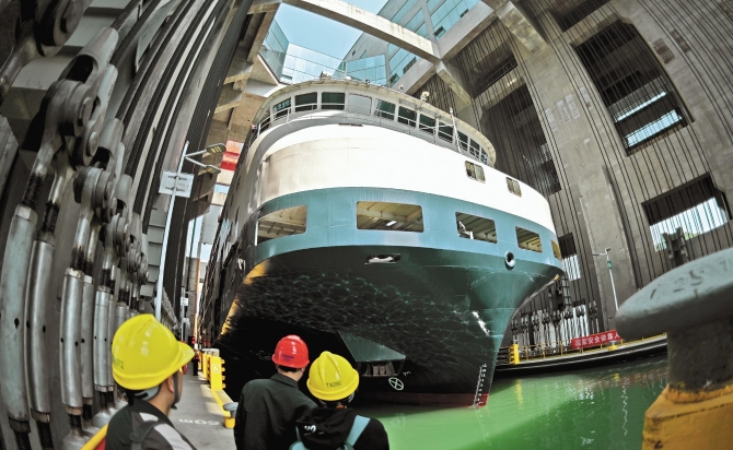 大型运输船“乘电梯”过三峡大坝(湖北日报全媒记者 刘曙松 摄)