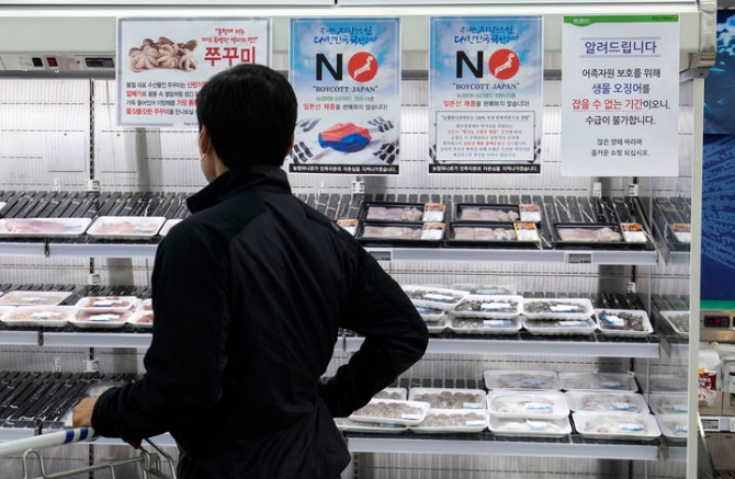 4月14日,韩国首尔一家农协连锁超市的水产商品货架前打出“抵制日本”“本店不销售日本产产品”等标语。新华社发