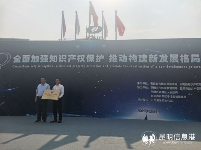 昆明信息港讯 记者李红鸾 4月26日,“2021年4.26知识产权宣传周启动仪式暨云南康乐茶文化城荣获国家级知识产权保护规范化市场授牌仪式”在云南康乐茶文化城举行。活动现场,云南省市场监督管理局党组成员、省知识产权局局长方涛为云南康乐茶文化城授上“国家级知识产权保护规范化市场”荣誉证书,这也是云南省首家获此殊荣的茶叶专业市场。