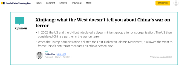 文章说,在美国应对“9·11”恐怖袭击作出反应的同一时期,中国新疆也经历了多次恐怖袭击。事实上,直到2020年年底,美国一直将“东突厥斯坦伊斯兰运动”列为恐怖组织。