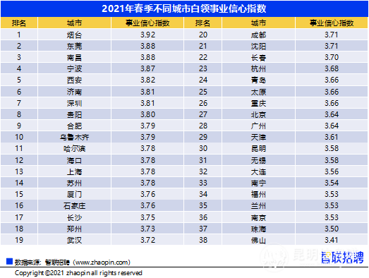 接受调研者中,昆明地区有50.7%的白领对2021年事业取得成就怀抱信心,同比扩张8.4个百分点,信心指数也由去年春季的3.12上升至3.58,虽然低于全国水平3.70,但在全国38个核心城市中仍排在第30名。