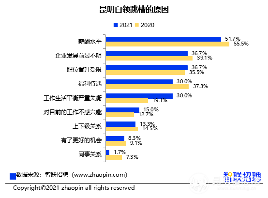 《智联招聘2021年春季昆明白领跳槽指数调研报告》近日发布,其中指出,昆明白领事业信心指数为3.58,同比上升,全国排名第30位。昆明白领计划跳槽的占比同比下降,但成功收获Offer(录取通知)的比例提升至8.7%。