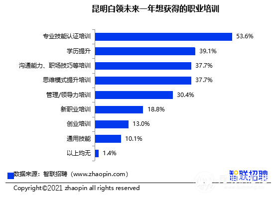 过去一年,20.3%的受访昆明白领获得升职加薪,5.8%的白领遭受职级下降与减薪,二者占比均低于全国平均水平。73.9%的人事业发展原地踏步,较全国更高。50.7%的白领接受了职业教育,高于全国平均水平。未来一年,53.6%的昆明白领希望获得专业技能认证培训,学历提升则以39.1%的占比排在其后。(昆明信息港 记者江枫)