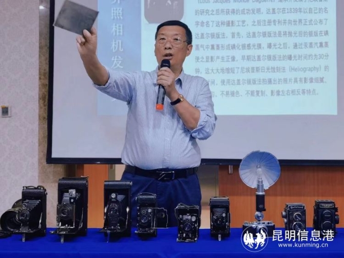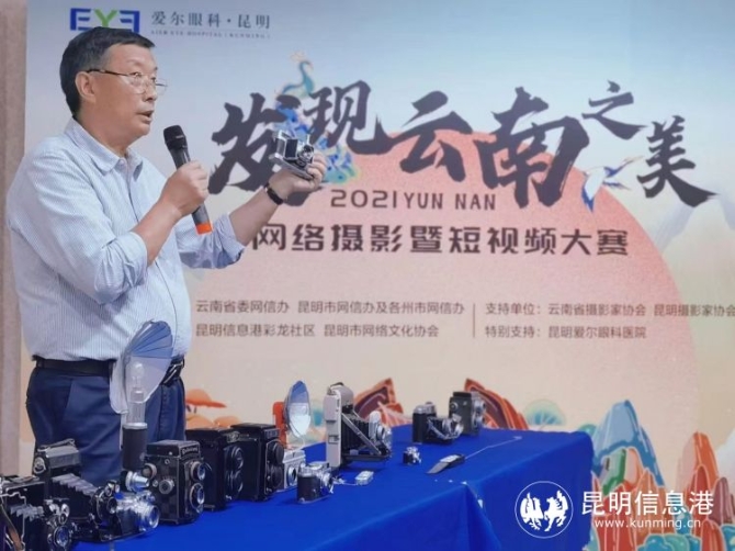 4月24日,2021“发现云南之美”网络摄影暨短视频大赛首期线下沙龙在昆明爱尔眼科医院三楼举行。彩龙社区特别邀请了相机收藏大家朱宝昆先生做现场分享。朱宝昆是中国民俗摄影协会副会长,昆明摄影家协会副主席,云南省收藏家协会常务理事,云南省摄影家协会会员,昆明收藏家协会会员。现收藏有600多台中外老相机和近千幅老照片(玻璃底片)和摄影文献(画册),所以人们也称他为相机收藏大家。本次沙龙,朱老师带了20余种老相机,带领现场朋友们从老相机里回顾相机的诞生和发展历程。
