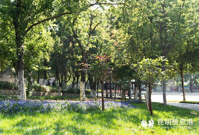 近日,记者走访盘龙辖区内的北辰大道、沣源路、景润公园花千谷等地,各种开花乔、灌木形成的道路绿化主题景观为昆明增添了别样光彩。