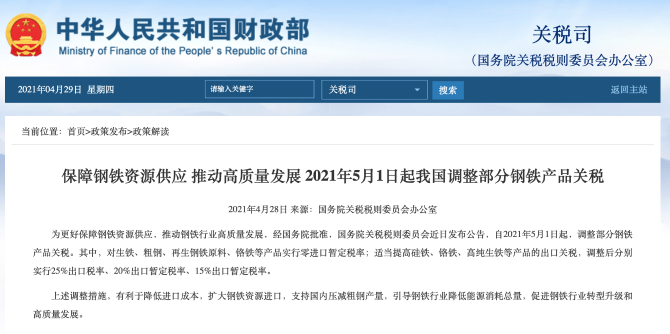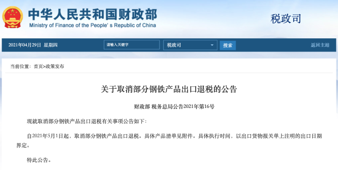 财政部、国家税务总局联合发布公告:自2021年5月1日起取消部分钢铁产品出口退税