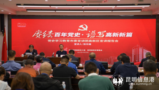 高新融媒中心记者张薇 为深入学习贯彻习近平总书记在党史学习教育动员大会上的重要讲话精神,持续把党史学习教育引向深入,推动昆明国家高新区党史学习教育扎实开展、取得实效,按照市委的统一安排,4月29日,昆明市委宣讲团成员张光福到昆明国家高新区开展“党史学习教育市委宣讲团高新区宣讲报告会”。高新区党工委书记陈勇主持会议、高新区管委会主任王迅及党工委、管委会班子成员,一至四级调研员,市纪委市监委派驻高新区纪检监察组领导,各部、委、办局,直属企事业单位,派驻机构,马金铺街道相关领导以及马金铺街道13个社区书记等百余人参加了宣讲报告会。
