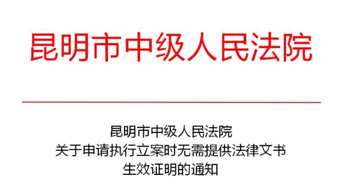 4月29日起 昆明两级法院执行立案无需提供法律文书生效证明