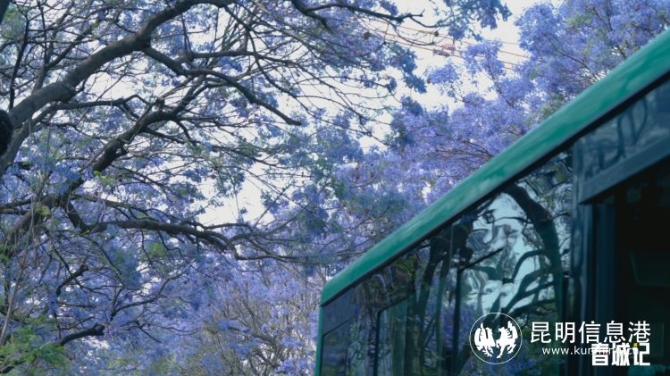 为确保市民安全欣赏蓝花楹,昆明公交以蓝花楹为主题,对两辆104路公交车进行融合美化。该路公交车起点巴士家园站,终点站为大观楼。途经教场中路等蓝花楹热门景点,整辆公交车以紫色为主色调,车内拉手、车顶、广告牌都是紫色,还有紫色的蓝花楹图案把公交车内外装饰得鲜艳夺目,让乘客在车内车外都可以看到蓝花楹。
