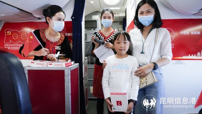 昆明信息港讯 记者上官艳君 为庆祝中国共产党成立100周年,瑞丽航空党委开展了系列党史学习教育,重温中国共产党成立100周年以来的光辉壮阔的百年奋斗史。5月1日,瑞丽航空党委将党史学习教育课堂搬到万米高空,以唱红歌、回顾党的历史等形式,与旅客现场互动,打造空中特色党史课堂。