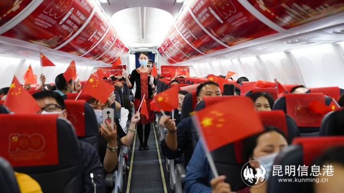 “今年是中国共产党成立100周年,在此,我们同本次航班的100多名旅客共同回顾了中国共产党光辉壮阔的百年奋斗史。感谢党领导中国人民取得伟大成就,让人民过上美好幸福的生活。”客舱广播中,瑞丽航空乘务组的党员代表深情说道。
