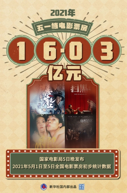 新华社北京5月5日电 国家电影局5日发布统计数据,5月1日至5日17时,全国电影票房达16.03亿元,其中《你的婚礼》《悬崖之上》两部影片分别以4.90亿元、4.74亿元领跑明显,占总票房约60%。