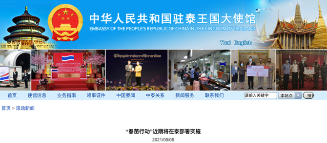 5月6日,中国驻泰国大使馆官网发布消息称,“春苗行动”近期将在泰国部署实施。自新冠肺炎疫情暴发以来,党和政府十分牵挂海外同胞的安全和健康。