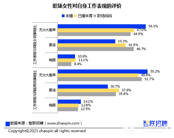 职场妈妈认为自己工作表现较同级女性同事更佳的占比为46.7%,高于已婚未育女性(41.9%)与未婚女性(35.3%)。在与同级男性同事相比时,51.7%的职场妈妈选择“无太大差异”,具有优越感的占比为35.8%。总体来说,职场妈妈对自身工作表现的评价高于其他职场女性。