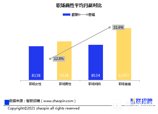 近日,智联招聘发布《2021年职场妈妈生存状况调查报告》,其中指出,职场妈妈的容貌焦虑低于其他女性,家务时长高于职场爸爸,家庭负担对职场妈妈的晋升限制明显大于职场爸爸,而婚育则加剧了两性收入落差,职场妈妈月薪平均比职场爸爸低31.6%。