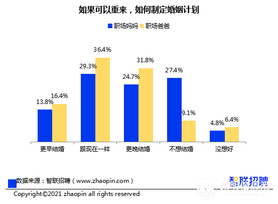 职场爸爸对自己的结婚计划感到满意,36.4%的受访者表示,如果重来还会坚持自己的选择,这一选项对职场妈妈来说仅为29.3%。“不想结婚”这一选项方面,职场妈妈为27.4%,是职场爸爸的三倍。